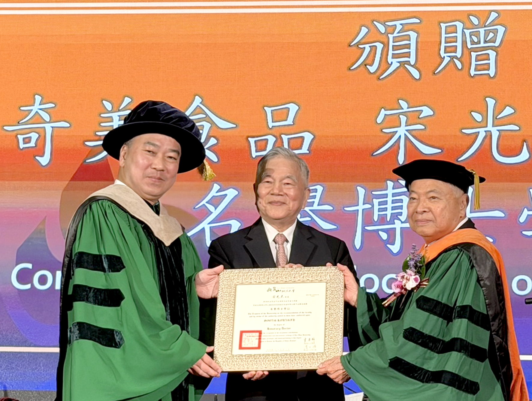 獲頒名譽博士的宋光夫董事長,曾兩度獲總統聘任為「無任所大使」,是極高的榮譽。宋光夫將科技思維導入食品製造,以一絲不苟的嚴謹態度帶領台灣水餃大軍進軍歐洲波蘭,展現強大的「暖食力」。崑大與奇美食品長期維持良好互動,雙方在人才培育及產學合作已有穩固基礎,近年更積極配合推動新南向與菲律賓國際專班,提供學生實務學習機會,促進學用接軌。