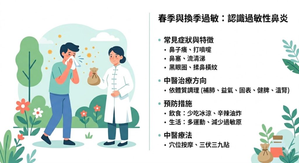 一到春天或換季就開始瘋狂打噴嚏、流鼻水,小心,可能不是感冒,而是過敏性鼻炎。中醫師指出,中醫會針對不同的體質以補肺、益氣、固表、健脾、溫腎為主進行治療,擊退過敏性鼻炎。