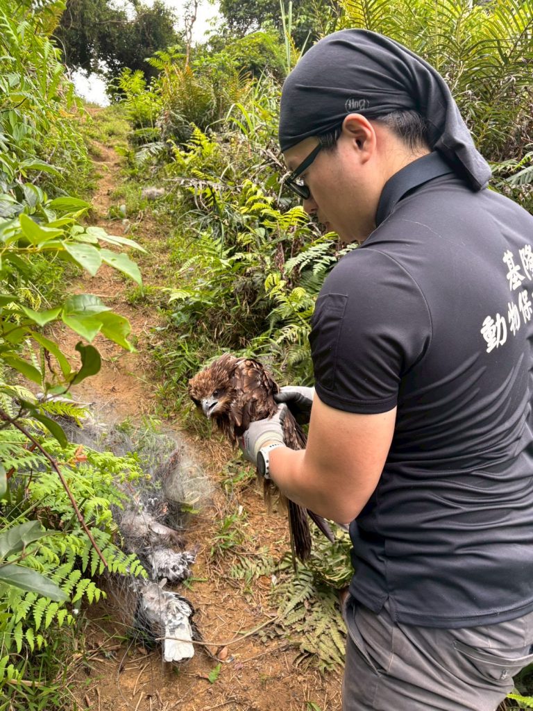 基隆市動物保護防疫所接獲民眾通報,於暖暖運動公園後方山區查獲一片大型的非法鳥網,動保人員趕赴現場後發現有十二隻鳥禽懸掛在網上,目視原本以為皆已氣絕,未料在準備收網清理時,一隻遭鳥網纏繞的保育類黑鳶竟突然「眨眨眼」展現出極強的求生意志,動保人員見狀即刻緊急後送至台灣猛禽研究會進行治療。