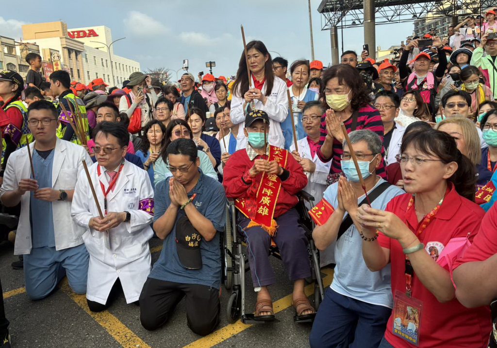 白沙屯媽祖昨日停駕童綜合醫院梧棲及沙鹿院區共七次,院方醫護人員跪拜祈求平安。(記者陳金龍攝)