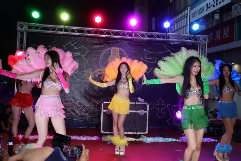 大甲媽祖遶境,有信眾在路旁架起舞台,請來辣妹表演熱舞迎駕。(記者陳金龍攝)