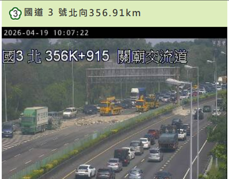 因應事故處理及散落物排除作業,高公局在上午封閉國道三號南向新化系統至關廟路段主線車道,暫時進行交通管制。現場開放出口減速車道供車輛通行,惟整體車流仍受影響,行經該路段的用路人須特別留意。