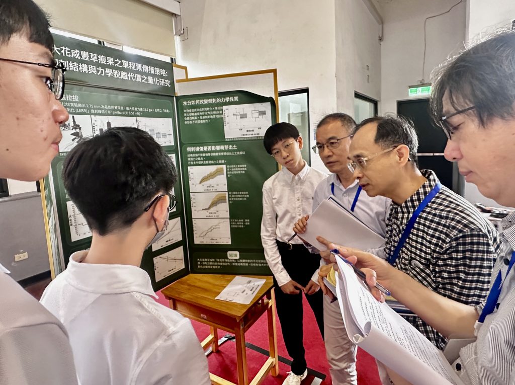 本屆科展評審過程、採現場展示與學生親自解說的方式進行,學生需向評審老師說明研究動機、實驗方法與成果,並即時回答專業提問,這不僅考驗學生的科學素養,更訓練其口語表達與臨場反應能力,展現學生科學探究的全方位成果。