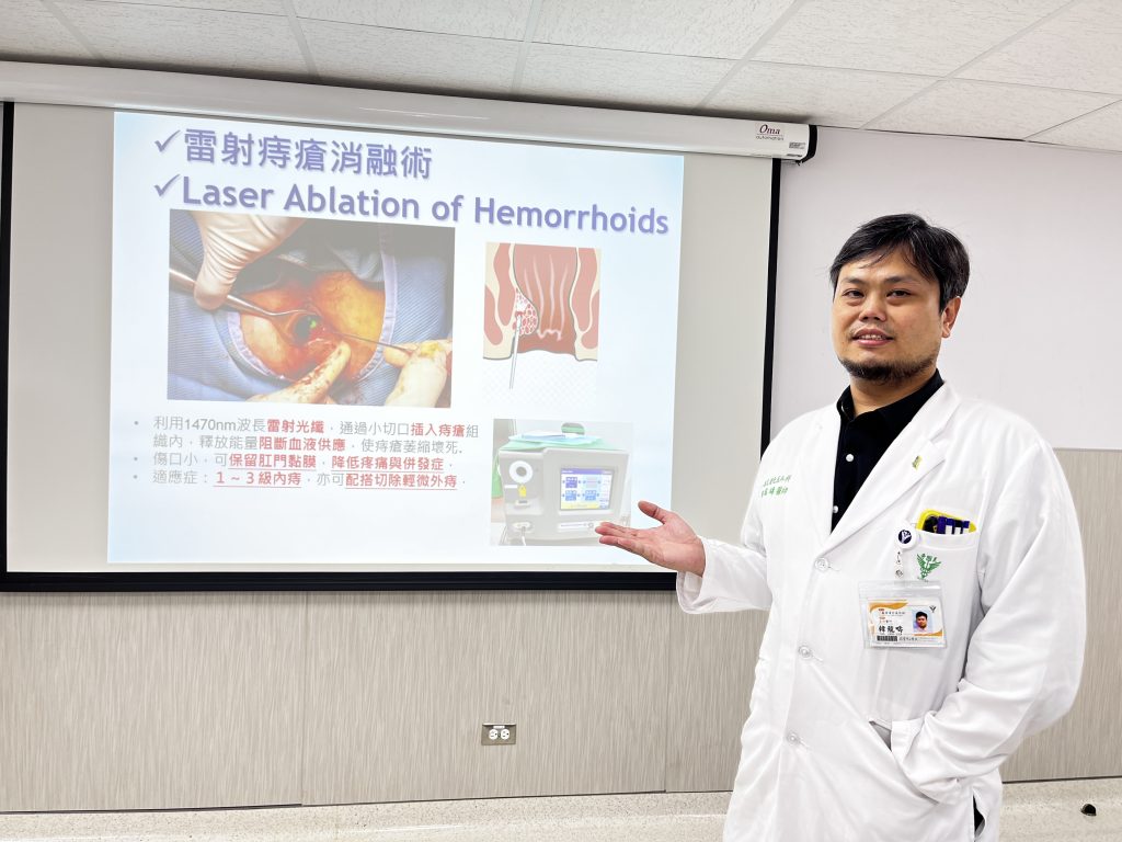 不少民眾常被痔瘡所苦,佳里奇美醫院大腸直腸外科醫師韓龍疇指出,傳統痔瘡治療以橡皮圈結紮、切除術方式,恢復期長達1到2週,新式的雷射消融手術隔天就能出院,傷口小、較不疼痛,成為治療新選擇。