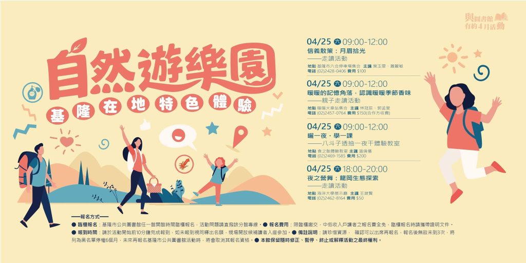 為推廣閱讀結合在地文化體驗,基隆市公共圖書館四月份「與圖書館有約」活動,將於四月二十五日同步在多個分館推出自然遊樂園系列活動,結合走讀導覽、生態探索與手作體驗,邀請民眾從不同面向認識基隆風土人文。