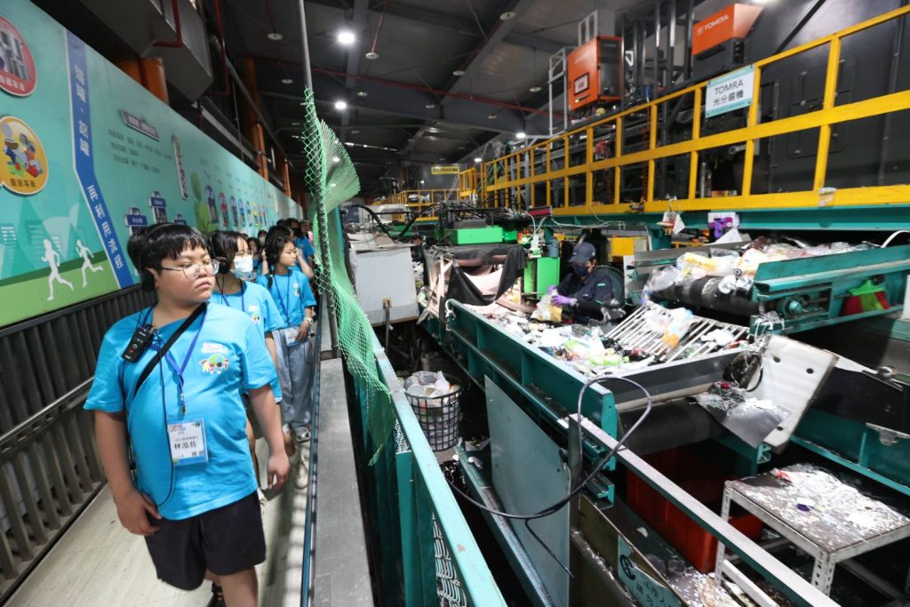 「AI資收分選場巡禮」課程,前往五股夏綠地的新北市資源循環教育基地,實地觀看AI科技及智慧分選機械手臂自動分類回收物,提升資源回收分選效率的過程。同時結合趣味桌遊,引導小局長們在互動中學習正確的資源回收分類知識,讓環保意識向下扎根。最後小局長們登上屋頂觀景平台瞭望五股夏綠地,見證昔日垃圾山整治前後的轉變,成為新北市展現資源循環及環境永續的重要成果案例。