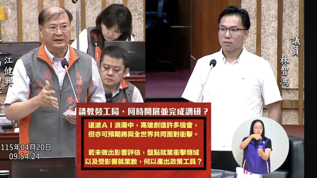 高雄市議員林智鴻廿日呼籲勞工局應儘速完成「AI對本市主流就業種類影響」的深度調查,落實人工智慧基本法條文中對於失業者的就業輔導責任。