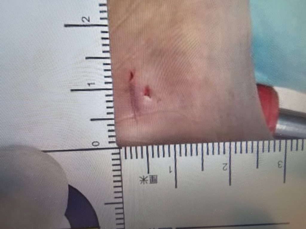這位婦人上週回診,理學檢查跟生命跡象一切正常,左腳兩個小洞的傷口也癒合的很好。她自述雞寮的環境乾燥有老鼠,常見的蛇有吃老鼠的南蛇跟眼鏡蛇,喜歡吃雞蛋的臭青母,以及魚塭旁吃青蛙的雨傘節。