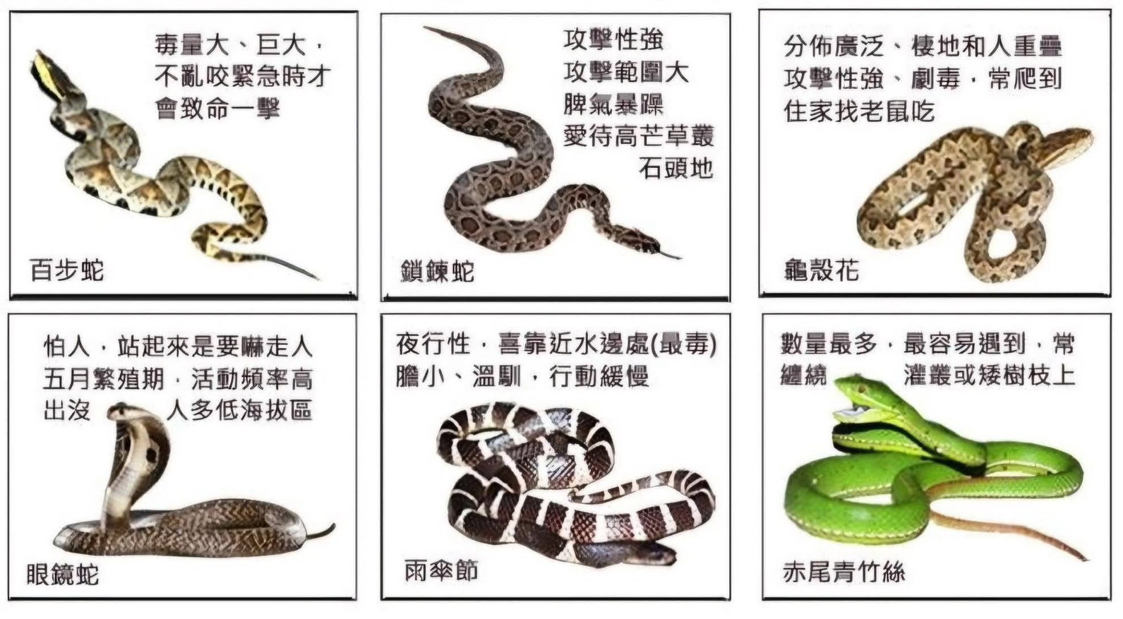 這種天氣蛇類開始活耀,安南區一位農婦在巡視雞寮時不小心被看起來像是眼鏡蛇的毒蛇咬傷,送成大醫院急診室觀察六小時,無血無腫返家,醫師告訴他是運氣好的「空咬」。但毒物醫師也呼籲民眾:無毒之蛇也曾咬死過人; 有毒的蛇沒有咬死人,只是運氣好。一旦被蛇咬,不論有沒有毒,還是到醫院觀察並接受治療為上策。