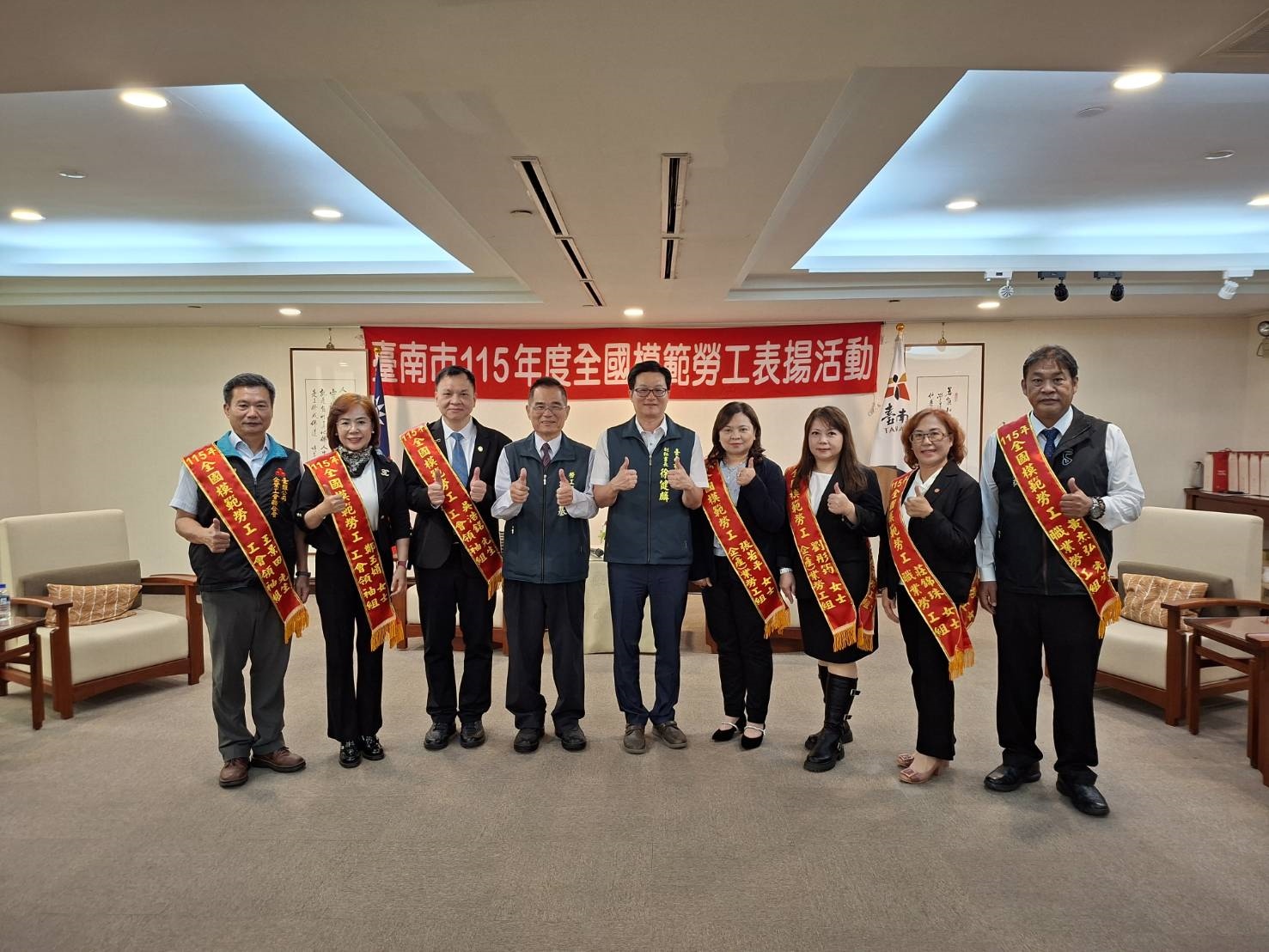 勞動節將屆,台南市共有七位優秀勞工獲得「全國模範勞工」殊榮,二十日在勞工局長王鑫基陪同下,分別前往府會拜會,由市府副秘書長徐健麟、議會秘書長顏昇祺接見,讚揚這些得主是台南之光,是基層一雄,為勞工職人典範。