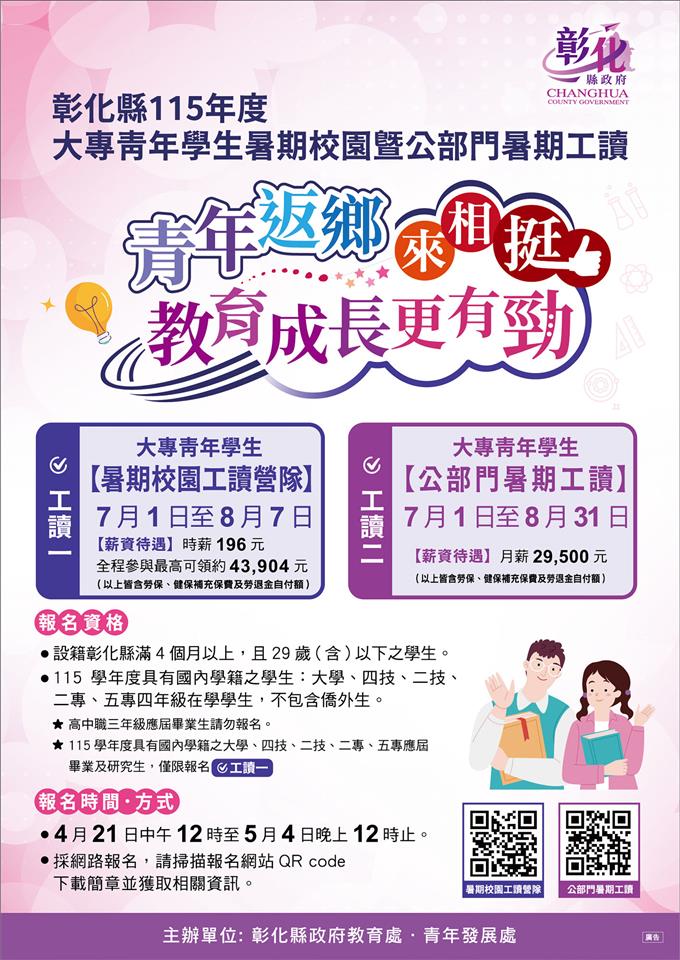 報名網址,暑期校園工讀營隊:https://svcs.chc.edu.tw/。公部門暑期工讀:https://is.gd/MYqc2v。