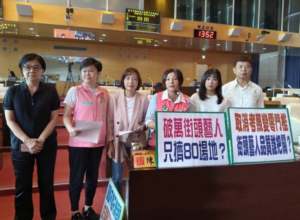 市議員陳雅惠、陳俞融、蕭隆澤、謝家宜、張芬郁、蕭隆澤二十一日聯合質詢,關心台中市街頭藝人表演空間不足以及登記門檻過低問題,要求市府補強。陳雅惠表示,目前台中街頭藝人已突破萬人,其中表演類約八千人,但全市公告展演場地僅約八十處,她質疑「一萬多人分八十個場地,合理嗎?」場地不足不只壓縮表演空間,也直接影響演出品質,甚至衍生搶場地、衝突等問題,長期下來將傷害城市文化形象。