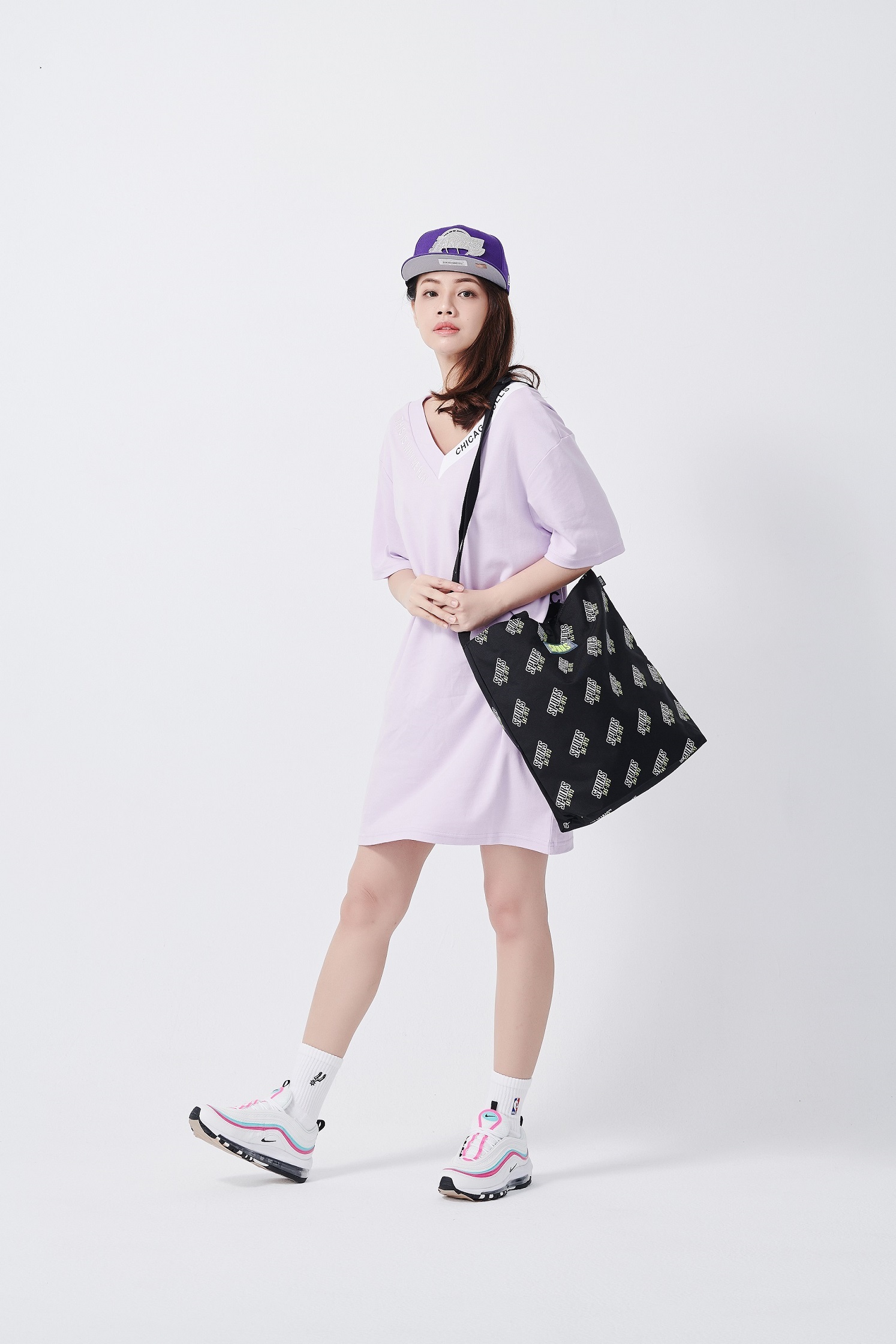 「C&S_滿版LOGO_短袖T恤」搭配亮色系長襪加以點綴。 記者陳建興/台北報導