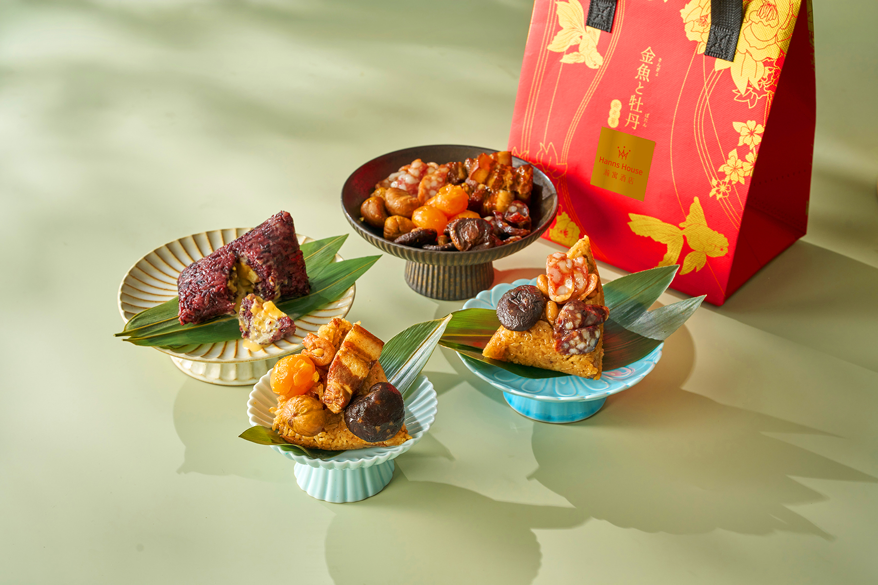 此次推出兩款鹹粽,各具鮮明風味層次。「紅樓傳香御品經典粽」承襲北部粽工藝,以特製油蔥酥結合金鉤蝦大火爆香,拌入長糯米炒製,成就香氣濃郁、口感Q彈的經典油飯;內餡嚴選肥瘦勻稱的台灣豬五花,經長時間細火滷製,醬香深入肉質,油潤鹹香而不膩,搭配鬆綿栗子與風味醇厚的香菇,層層堆疊出扎實豐富的傳統滋味。「紅樓富貴三寶臘味粽」則以廣東經典風味為靈感細緻演繹,匯集臘腸、肝腸與臘肉三重臘味精華,融合香菇、金鉤蝦與鹹蛋黃等食材,經特製醬汁緩緩滲入糯米後一同蒸製,外層以粽葉包裹,散發淡雅草本氣息,襯托出臘味的濃郁醇厚,整體層次分明,展現經典港式風味的深厚底蘊。