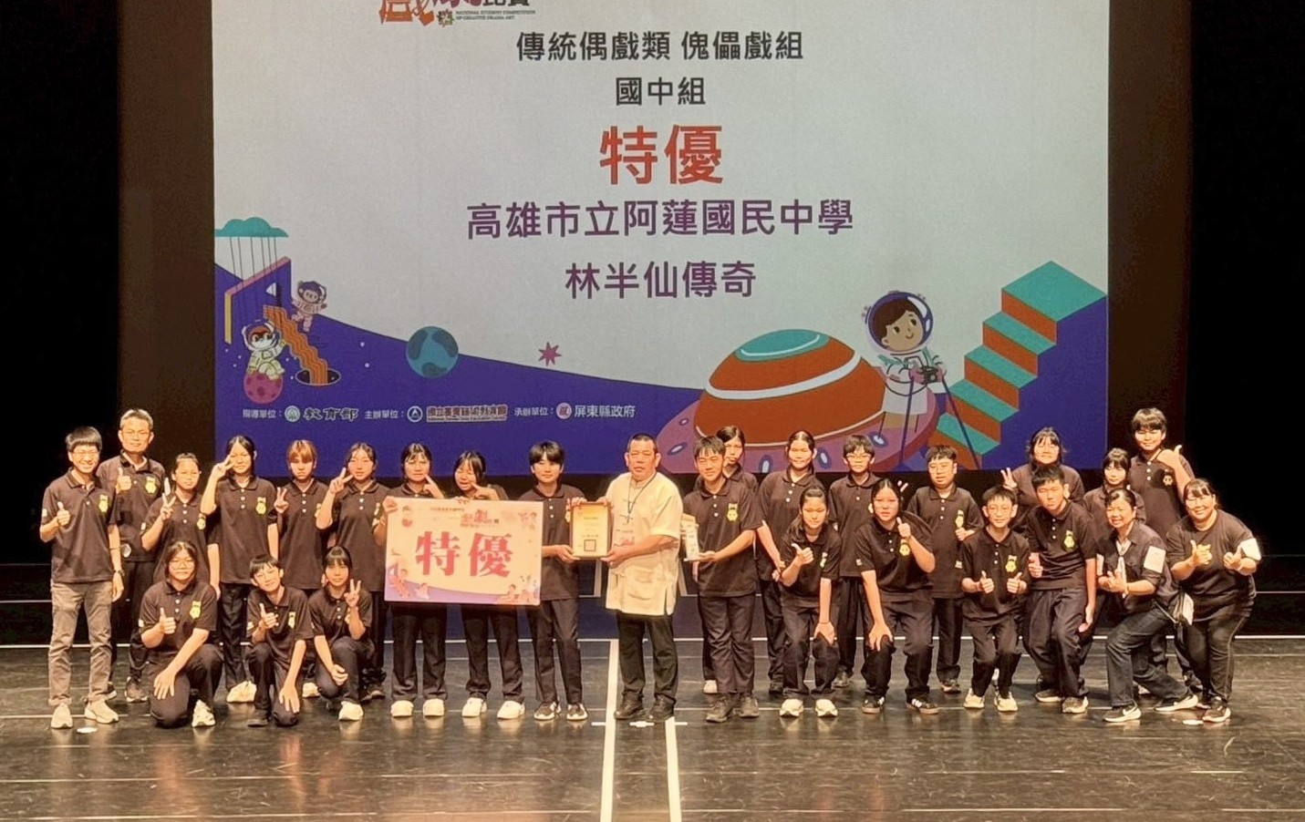 高雄市立阿蓮國中傀儡偶戲社再創傳奇,在「一一四學年度全國學生創意戲劇比賽」中,學生憑藉精湛技藝演出劇碼《林半仙傳奇》,成功蟬聯傳統偶戲類「特優」獎項。這已是該校連續第 十一年摘下全國最高榮譽,展現基層藝術教育的深厚實力。