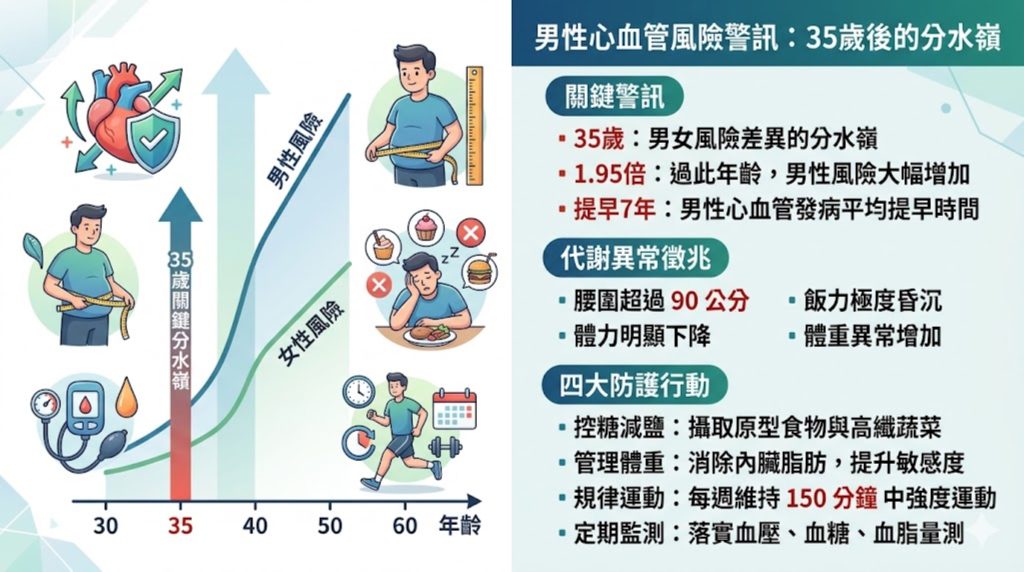 研究發現,男性的心血管疾病的發生時間比女性平均提早約7年,而35歲正是出現風險差異的分水嶺。醫師指出,台灣男性代謝症候群盛行率明顯高於女性,但門診就診比例卻長期「女多於男」,形成所謂的「醫療真空期」,可能是影響心血管風險差異的因素之一。