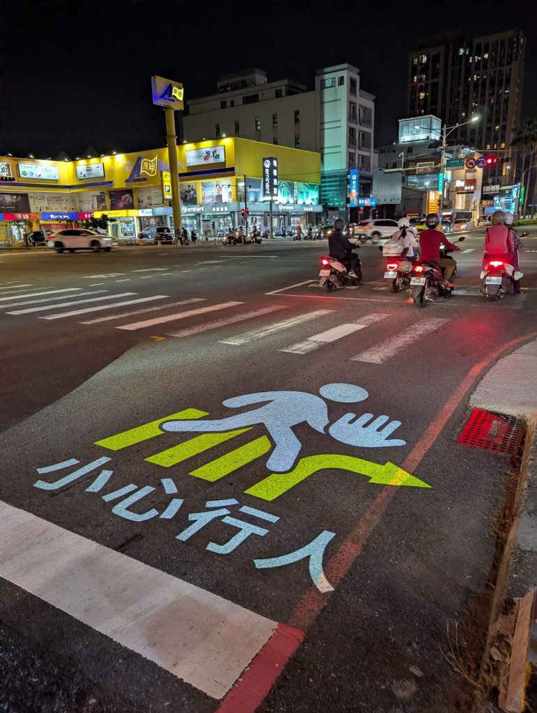 此外,在慢車道右轉路口時,地上也劃設「小心行人」,上方有大大的行人走斑馬線圖案,提醒用路人注意。