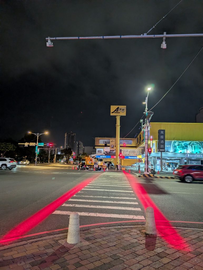 當行人踏上斑馬線,科技裝置感應後,會開燈照亮行人,讓駕駛更可以看清行人蹤跡;另,既有斑馬線(行人穿越線)兩側也增設鮮明的紅色燈光線條,明確框出行人行走區域,提醒行人不要走出安全範圍,也能對往來車輛產生強烈視覺提醒,加強夜間或視線不良時的路口辨識度。