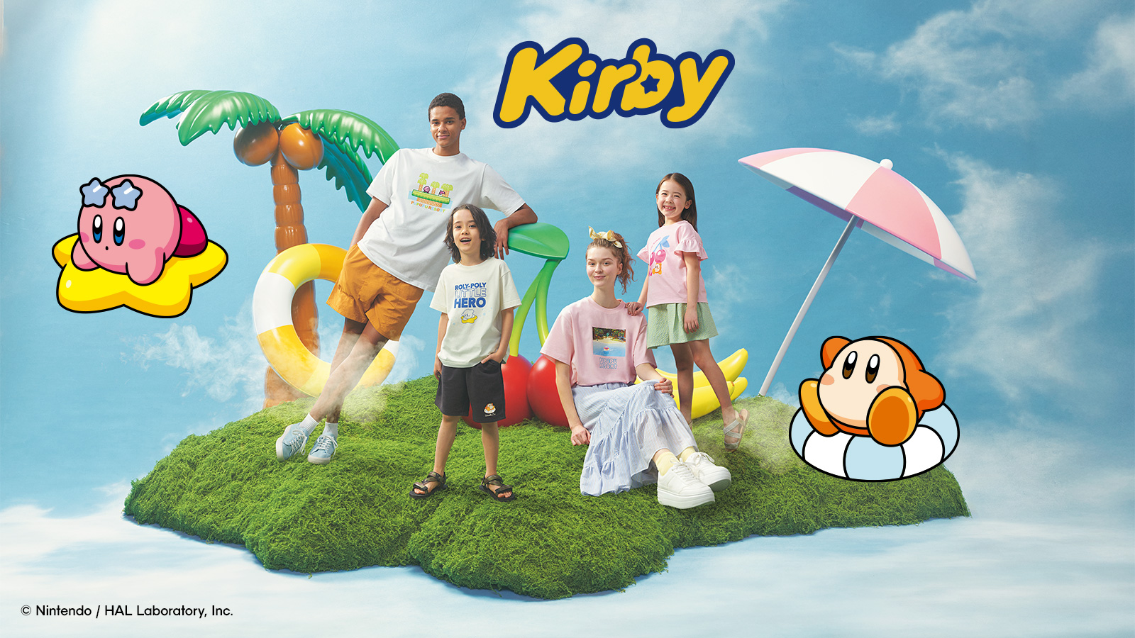 女裝與童裝以美食滿載的「PUPUPU RESORT」為靈感,推出水果、甜點印花 T 恤、家居服與小包等單品,展現卡比與瓦豆魯迪在度假村玩耍、享用美食、慵懶小憩的畫面。男裝T恤融合遊戲初期採用的像素風格,展現「復古馬賽克」的可愛魅力;家居服的圖樣設計加入椰子樹等夏日意象,並以「坐在泳圈上放鬆的瓦豆魯迪」作為吸睛亮點,展現清爽自在的度假風格。