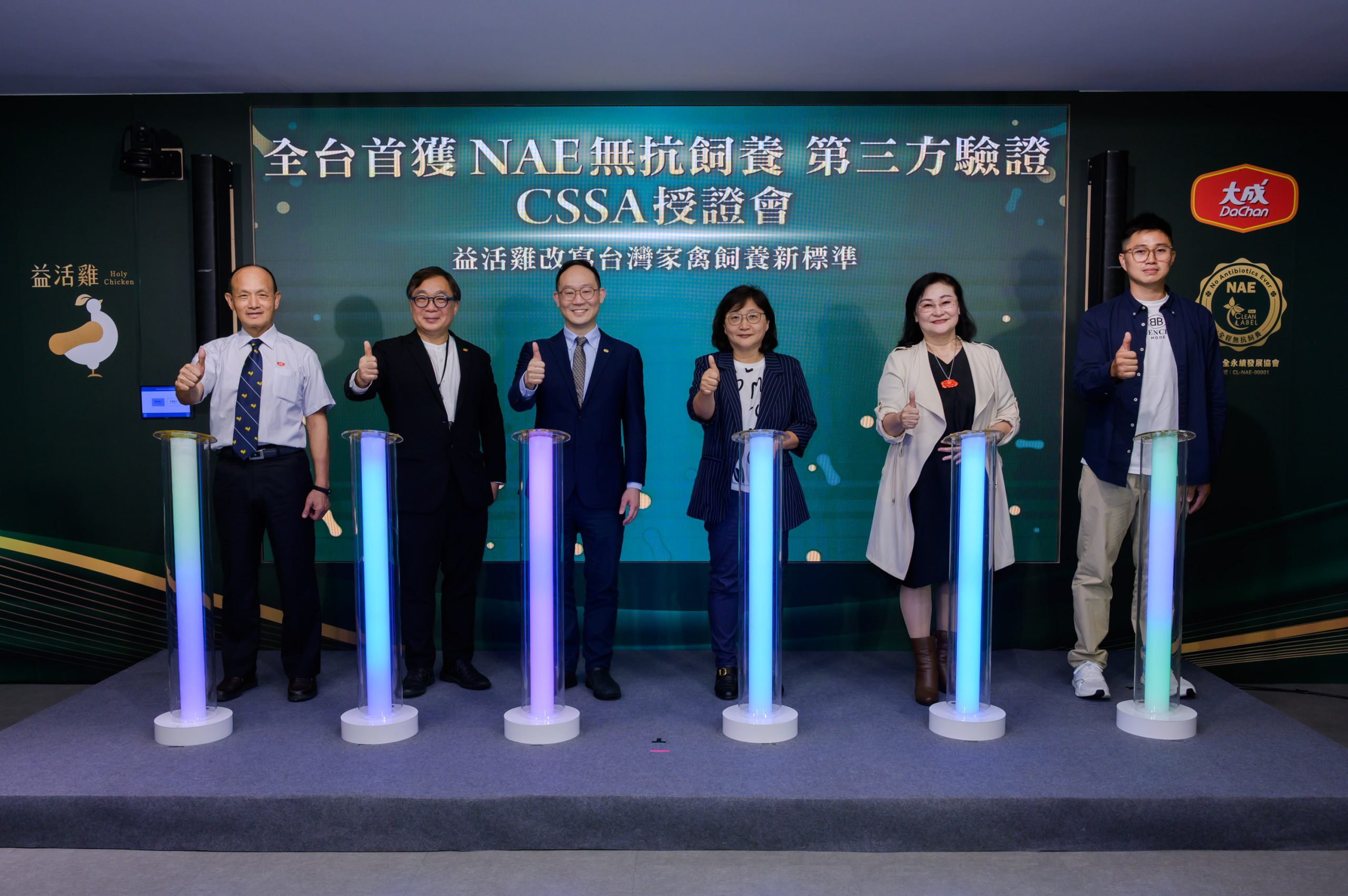 大成集團總經理韓芳豪表示,很榮幸能成為全台灣第一位NAE全程無抗飼養獲得CSSA第三方驗證的企業,證明台灣有能力建立與國際接軌的無抗飼養體系,全面提升食品安全、強化產業競爭力,並帶動肉雞產業邁向更健康、更永續的未來。為了打造全程無抗飼養的供應鏈,大成結合了動物營養、獸醫、養殖以及食品科學等專家共同從飼料配方、專利益生菌、飼養管理、生物安全等多方面著手提升雞隻的健康,以科學為基礎,逐步摸索出最適合台灣的無抗飼養模式,感謝團隊的努力,未來益活雞會持續擴大規模,並且推廣到各大通路。