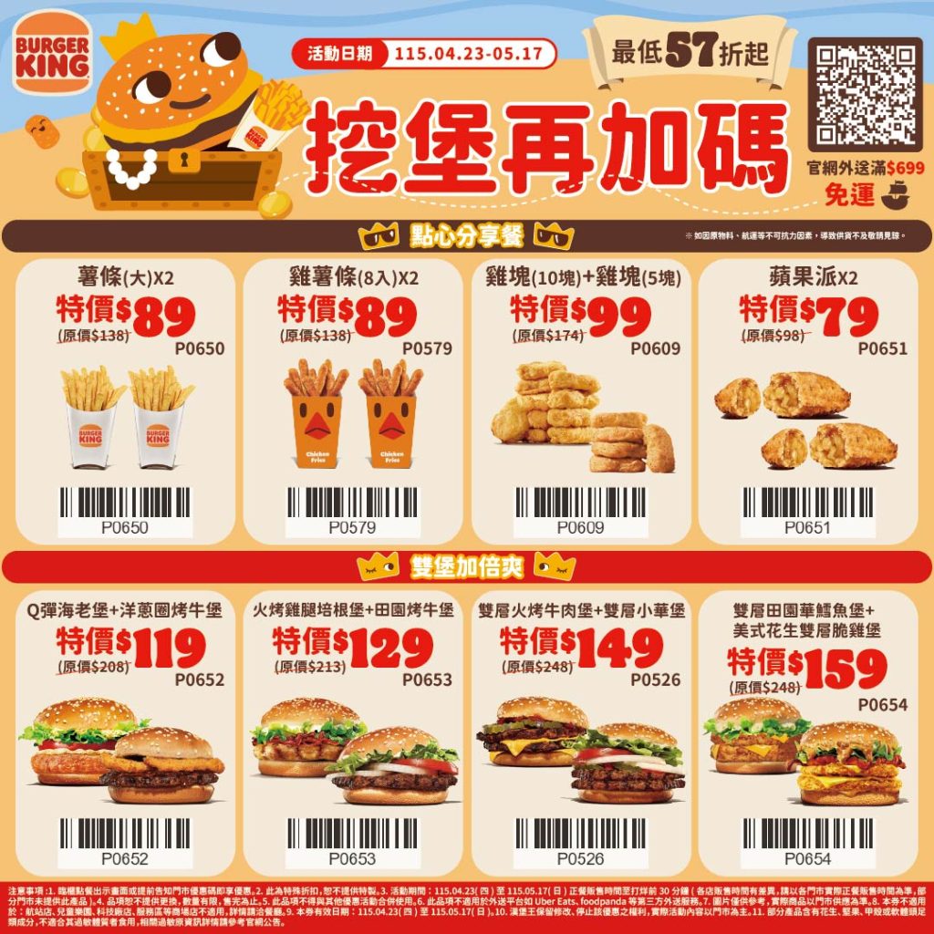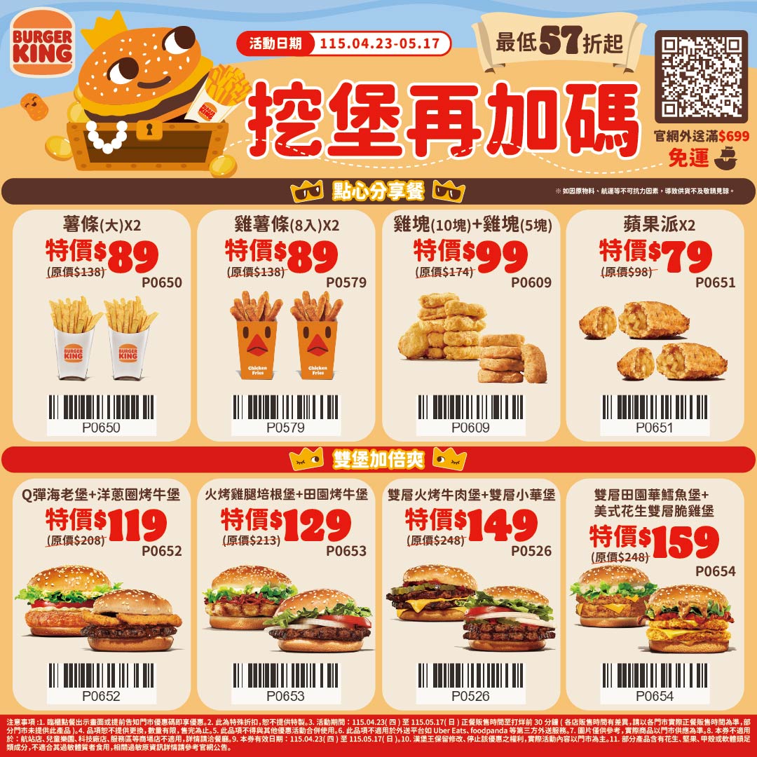 漢堡王回饋粉絲,近期好康不斷,即日起至5月17日,推出限時25天點心餐、雙堡組專屬的「挖堡再加碼優惠券」,好康57折起,包括挑戰同業最低價的「15塊雞塊99元」,還有漢堡王獨家人氣美食雞薯條也祭出雙份89元優惠價。