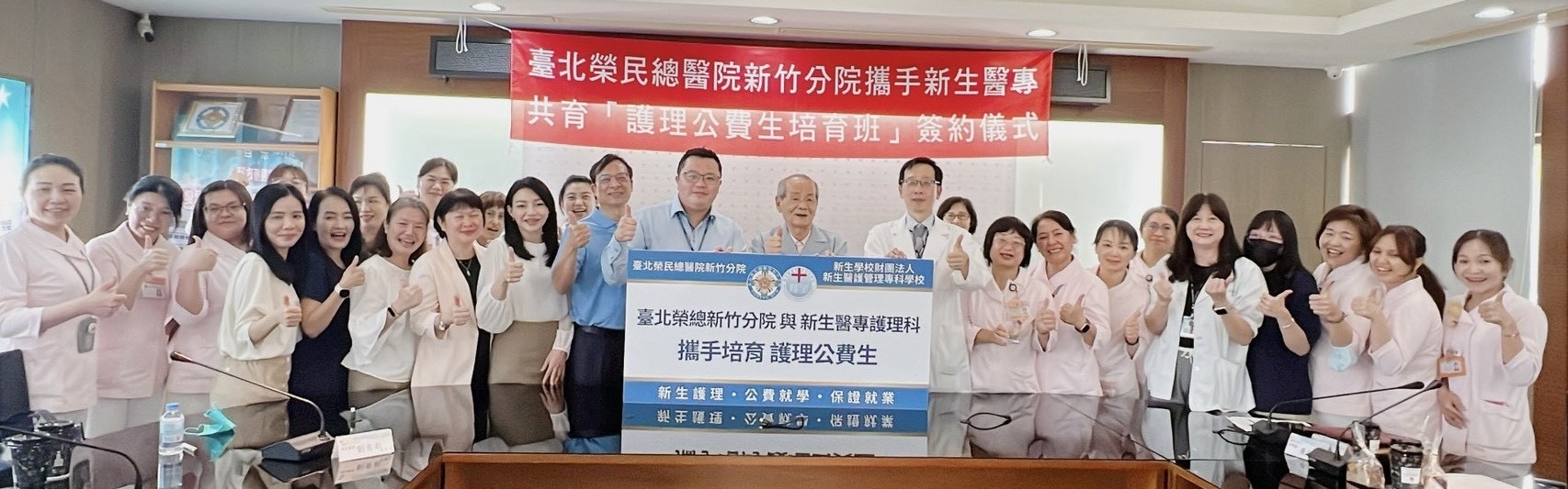 臺北榮民總醫院新竹分院廿三日正式與財團法人新生醫護管理專科學校簽署「攜手培育護理公費生」計畫,雙方透過產學深度結盟,提供公費生每人每年十二萬元獎助學金,旨在緩解偏鄉護理人力缺口,深耕在地人才培育,翻轉職場環境,達成「入學即就業,畢業即留用」的共榮目標。