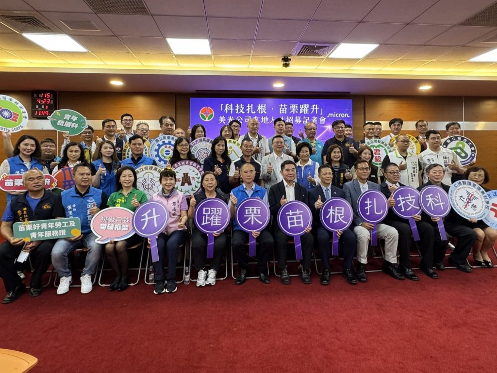 苗栗縣政府攜手美光科技公司二十三日辦理「科技扎根.苗栗躍升」在地人才招募記者會。隨著美光科技於苗栗縣銅鑼鄉設立新廠,預計於今年底前招募約一千名新進員工,為苗栗就業市場注入具規模且高品質的人力需求,展現國際大廠深耕在地的具體行動。