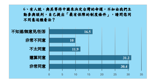 至於,「誰能保障台灣人的安全與幸福,我們就應該支持誰」問題,同意者高達百分之六十五點八,不同意者僅百分之十五點九。更有六成一的民眾支持台灣主動談判對我方最有保障的制度條件,不同意者僅百分之二十一點九。