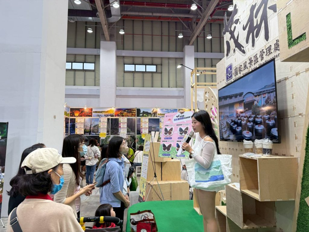 在展場設計上,採用可重複使用的模組化木作結構作為主要建材,搭配紫斑蝶意象與大量綠色植栽,營造清新自然的山林氛圍,同時傳遞高屏山麓豐富的生態資源,實踐永續旅遊理念,展現環境友善的新型旅遊型態。