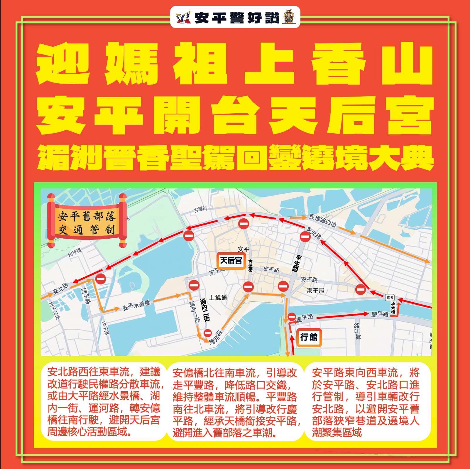 警四分局呼籲民眾提前規畫行車路線,避免進入壅塞路段。週末活動期間,警方將於安平路、安北路口進行管制,引導車流避開安平舊部落狹窄巷道及遶境人潮聚集區域,安北路西往東民眾建議改道行駛民權路,或由大平路經水景橋、湖內一街、運河路,轉安億橋往南行駛,避開天后宮周邊核心活動區域。平豐路南往北則將引導駕駛改行慶平路,至健康三街左轉承天橋,銜接安平路。另將於安億橋北往南路線引導直行平豐路,以維持整體車流順暢。