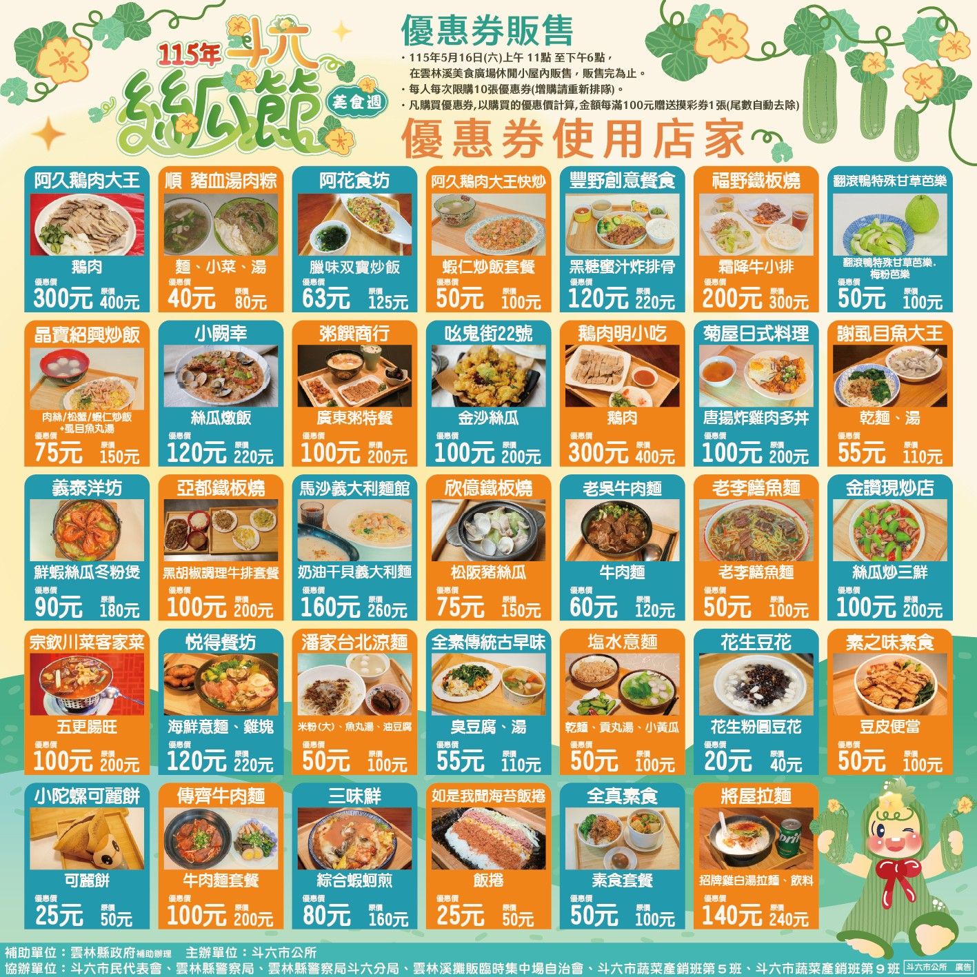 林聖爵說,優良農產品結合雲林溪美食廣場店家辦理絲瓜節美食週,期產生加乘效益帶動觀光人潮。絲瓜節美食週五月十六日登場至五月三十一日,為讓更多人品嘗「翠玉絲瓜」及店家料理的美味,加碼推出美食優惠券於五月十六日上午十一時起,在雲林溪美食廣場內的休閒小屋開賣,有三十四家美食可供選擇,餐價在二百元以下的只需一半價格就能購得;二百元以上可優惠一百元相當划算,每人每次限購十張優惠券,金額每滿一百元贈摸彩券一張。