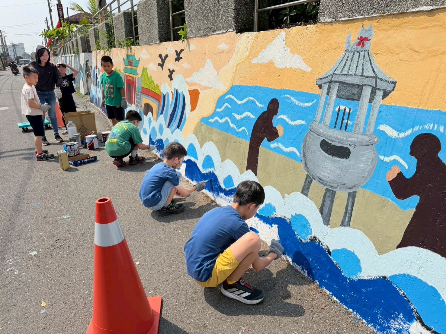彩繪牆以蚵子寮「家鄉故鄉」為敘事主軸,譜寫家鄉前世今生:從「驚滔駭浪」重現早期討海的艱困,到「靈威守護」筆繪海洋文化信仰的平安祈願;轉而延伸至「漁躍港灣」展現當代漁產外銷與烏金產業的繁榮,最後由學生落筆「海洋永續」,將SDGs守護海洋的觀念與童趣想像結合。