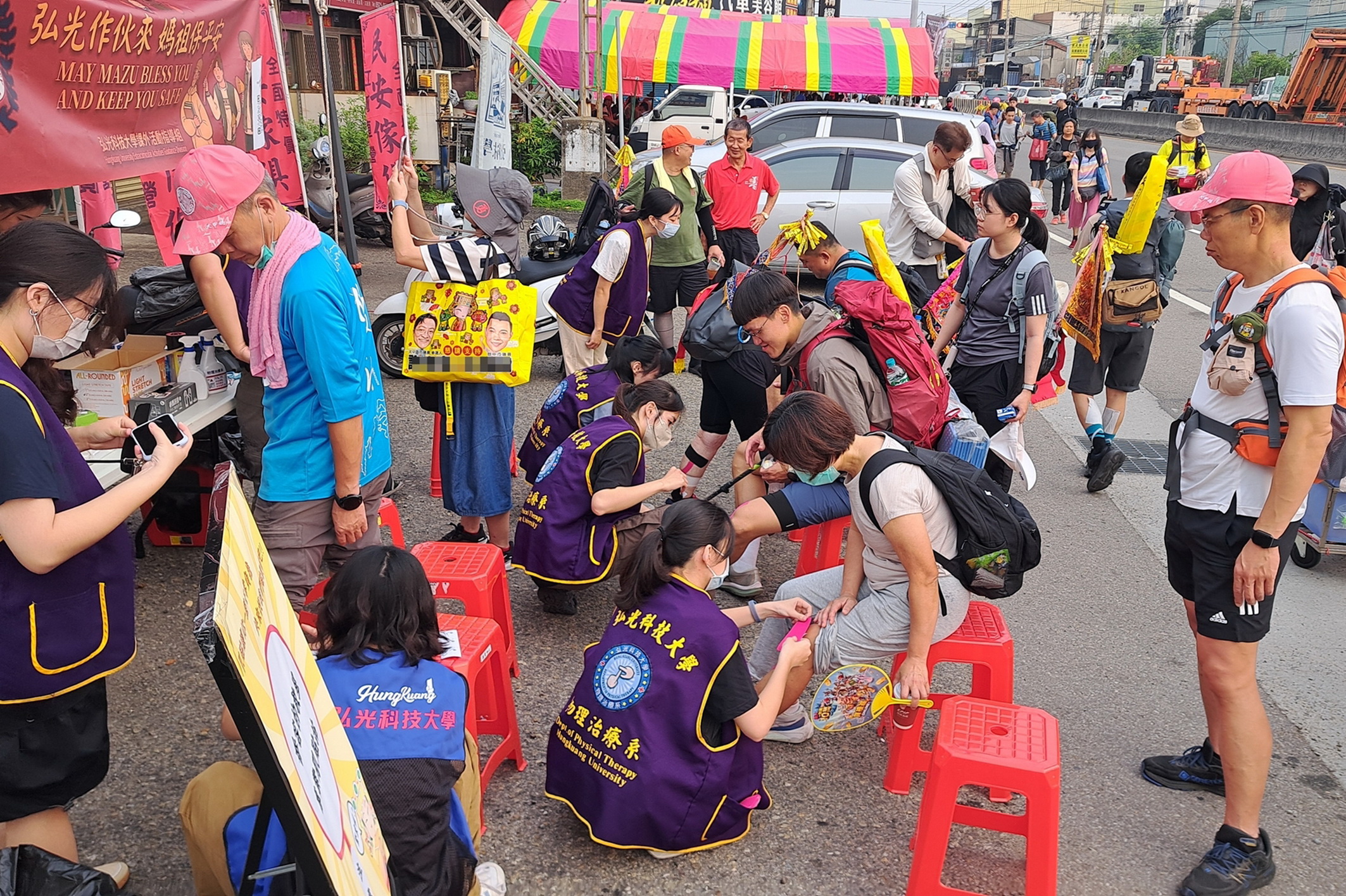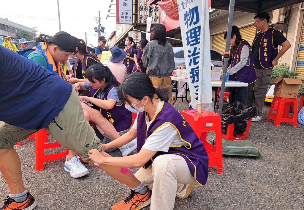大甲媽祖遶境進香活動長途跋涉,對香客的體能是一大考驗。弘光科技大學物理治療系副教授楊文傑率領18名學生,組成「與神同行勇腳防護隊」,提供香客專業的運動貼紮服務。師生發現,香客們第1天步行30公里左右,便因長時間行走,造成小腿痠痛、關節腫脹及肌肉緊繃等問題,還有人因未慎選鞋襪,腳磨破皮又起水泡,安全防護的需求極為迫切。