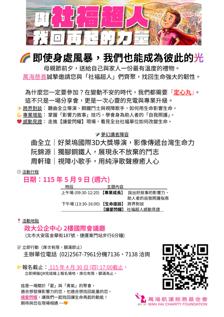2025年度萬海慈善【讓愛閃耀】捐贈儀式暨社福增能培力座談會,將於2026年5月9日(星期六)在政大公企中心2樓國際會議廳溫暖登場。本次活動以「每個人都能成為助人的力量」為核心規劃,透過專題演講、第一線中小型社福單位服務的暖心故事,並跨界邀請《超人再起》曲全立導演與劇中超人主角現身分享,期望使社會大眾了解如何陪伴困境中的人們找回生命韌性。