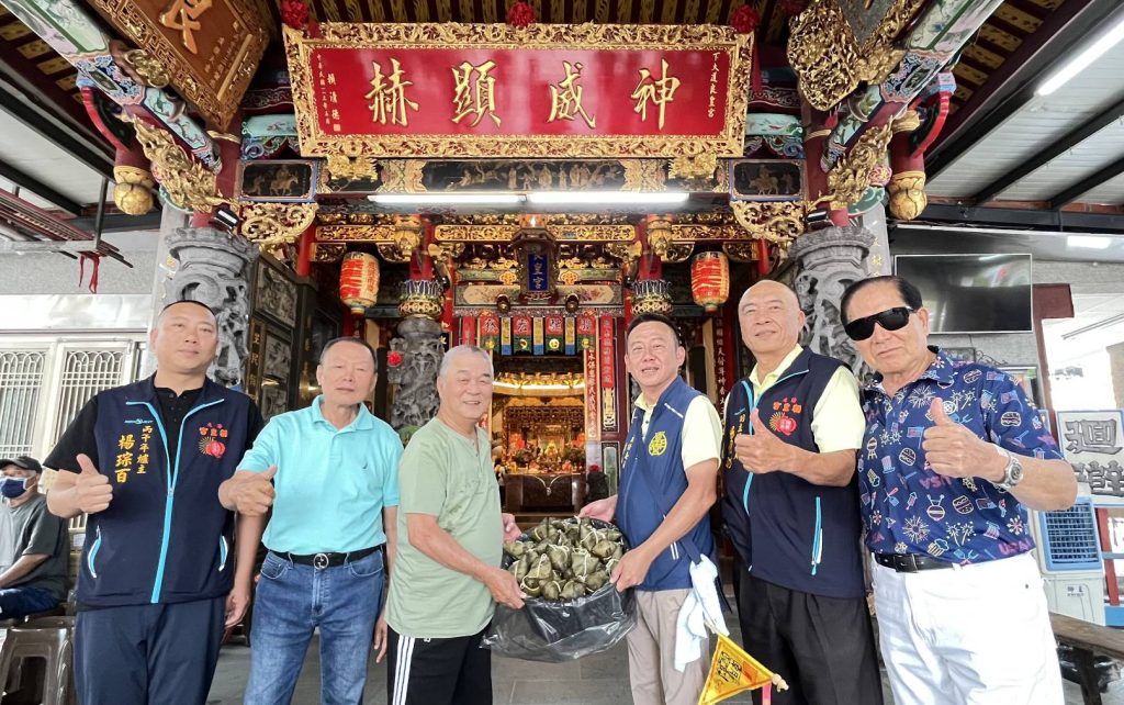 下大道良皇宮準備粽子分享海尾朝皇宮,象徵當年涉水渡溪救災的情誼。(記者陳治交攝)