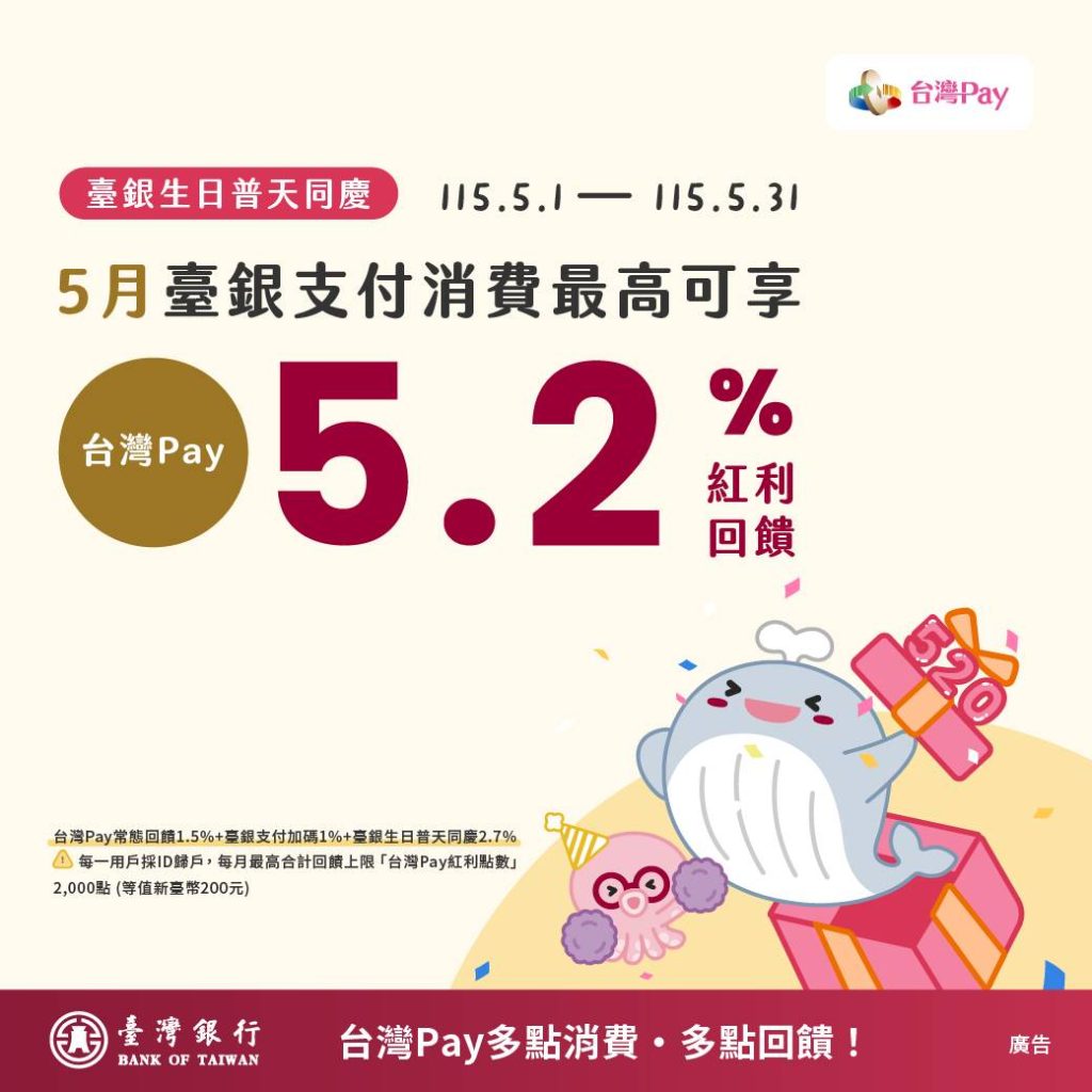 活動一:臺銀生日普天同慶_5月臺銀支付消費最高可享台灣Pay5.2%紅利回饋。(臺銀提供)