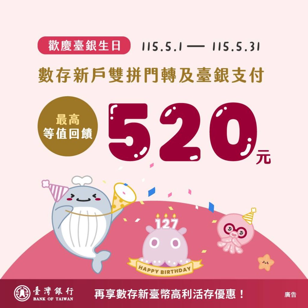 為歡慶臺灣銀行5月20日行慶生日,並回饋客戶長期支持,臺灣銀行整合「臺銀支付」及數位存款服務,推出「臺銀生日普天同慶」系列活動。5月期間限時祭出多項加碼優惠,從日常消費支付到數位帳戶手機門號收款服務,讓民眾於日常金融使用情境中,輕鬆累積回饋。
