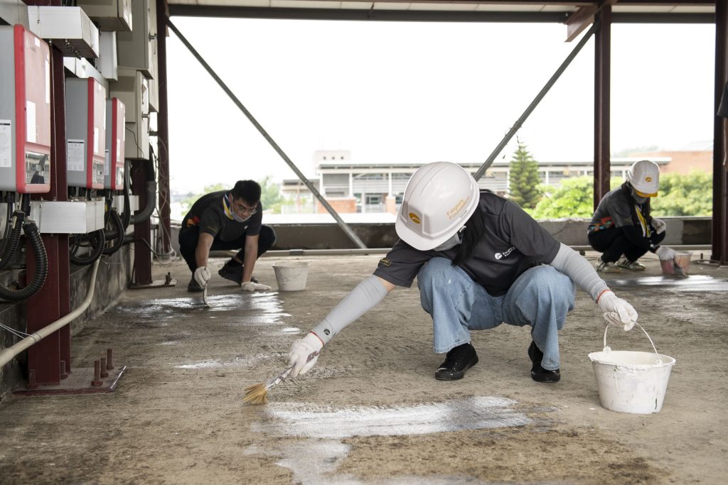 另一組志工則同步進行屋頂防水工程,為改善長期漏水問題,先完成地面清空、管線架高與環境清潔,隨後塗刷第一層稀釋防水漆填補細微孔隙,待乾燥後再施作第二層高密度防水塗料,進一步提升整體防滲效果,從源頭改善校舍老舊滲漏問題。