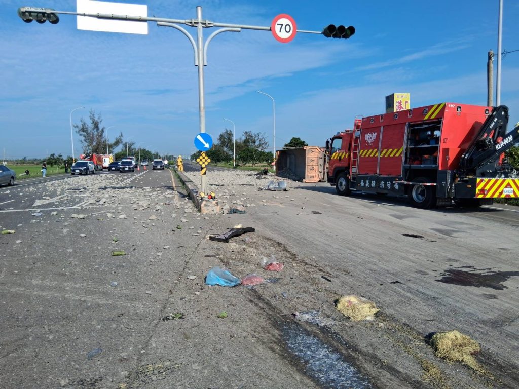 嘉義台82線發生砂石車、重機與自小客車三車事故,現場散落物滿地。(記者張翔翻攝)