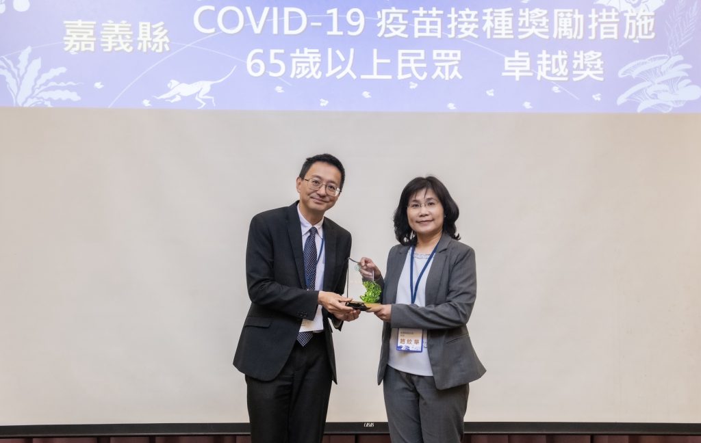 疾管署署長羅一鈞(左)頒發獎項予嘉義縣衛生局長趙紋華(右),肯定嘉義縣防疫績效榮登全國第一。(記者張翔翻攝)