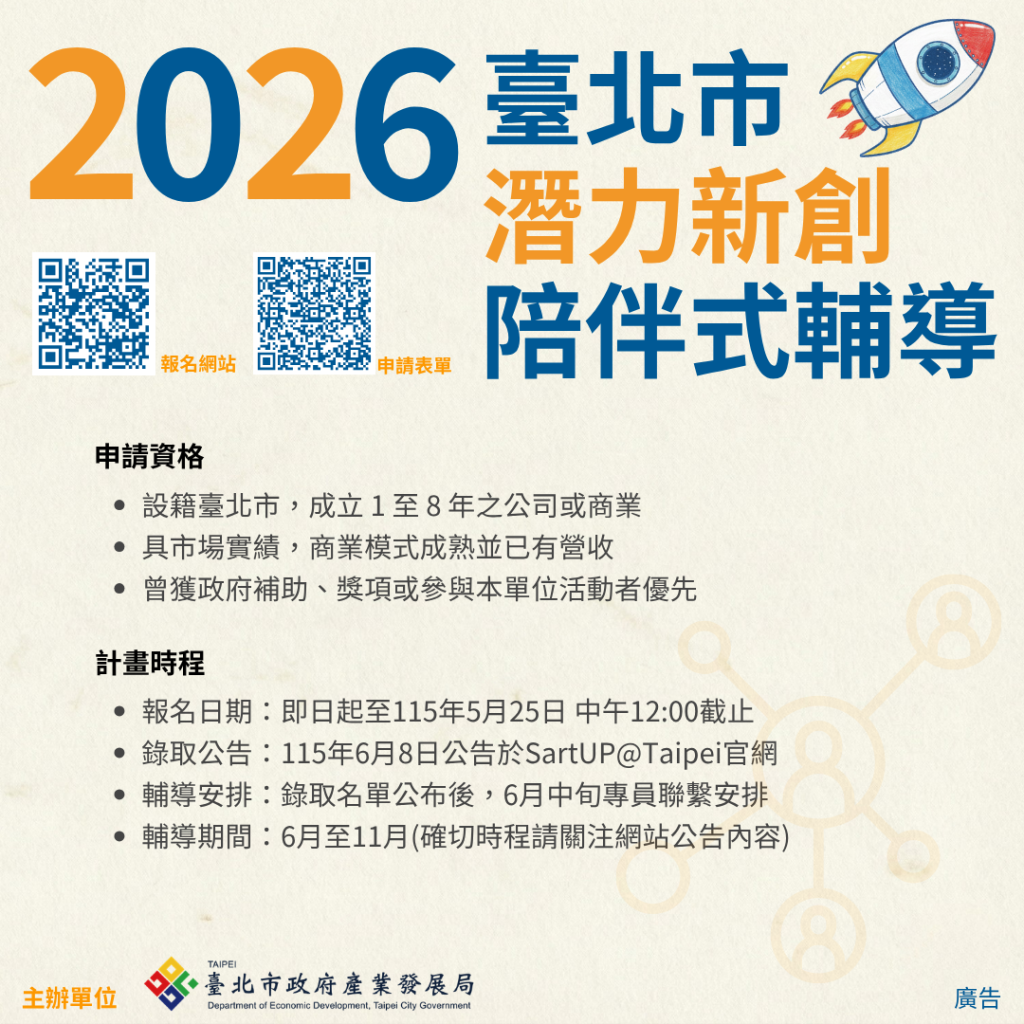 台北市產業發展局於二十八日宣布啟動「台北市潛力新創陪伴式輔導計畫」,鎖定商業模式已臻成熟且具高度擴張潛力的新創企業,透過重量級業師一對一深度輔導、資源串接與同儕交流等機制,協助新創團隊突破營運困境、強化核心競爭力。本期計畫預計甄選十五案,報名自即日起到五月二十五日中午十二時截止。