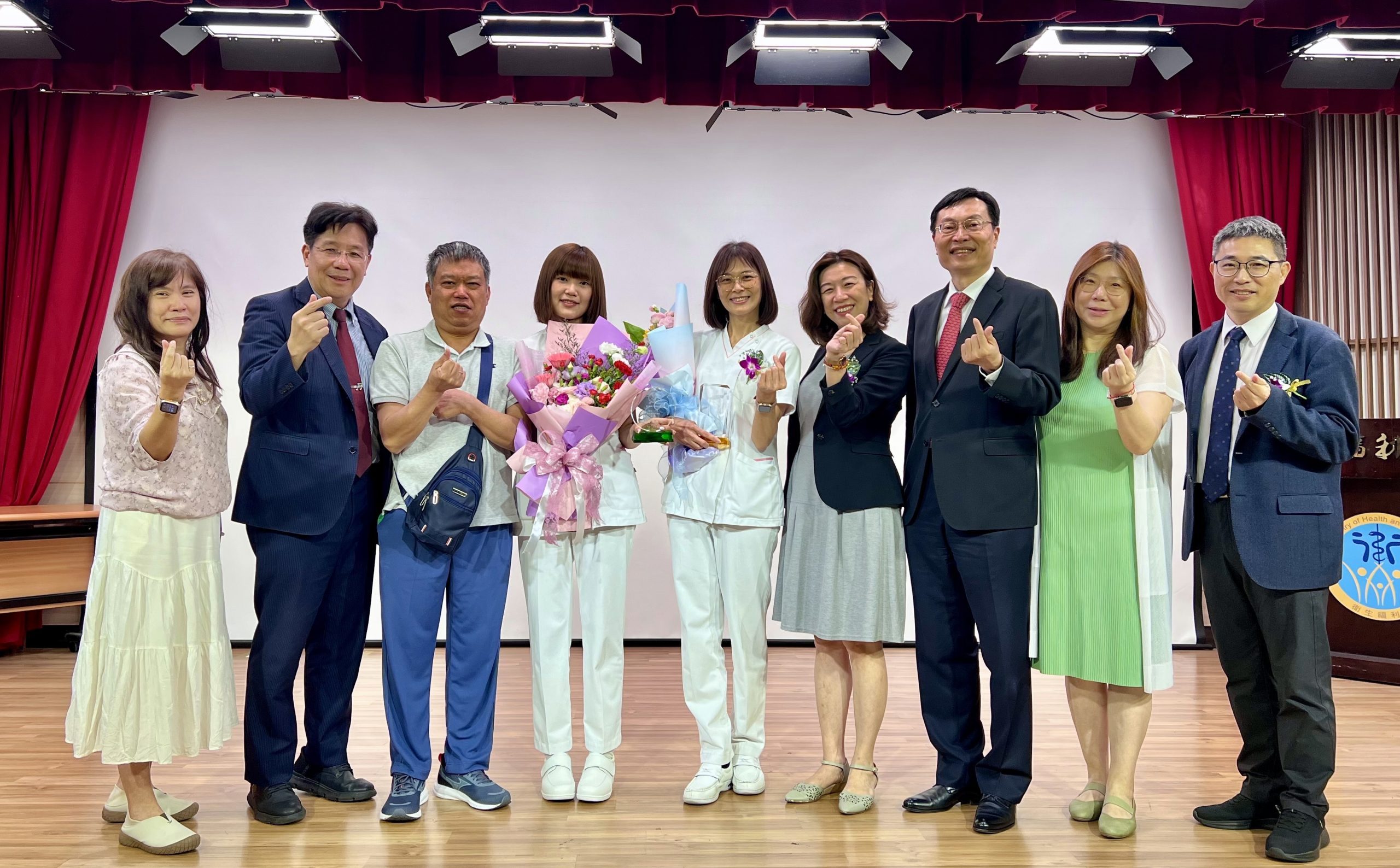 桃療院長廖定烈與護理主任邱金快特別關心護理同仁,均親自出席頒獎典禮為曾珮軒親自獻上祝賀與鼓勵,曾珮軒父親也一同前往觀禮,其父親表示以女兒為驕傲。