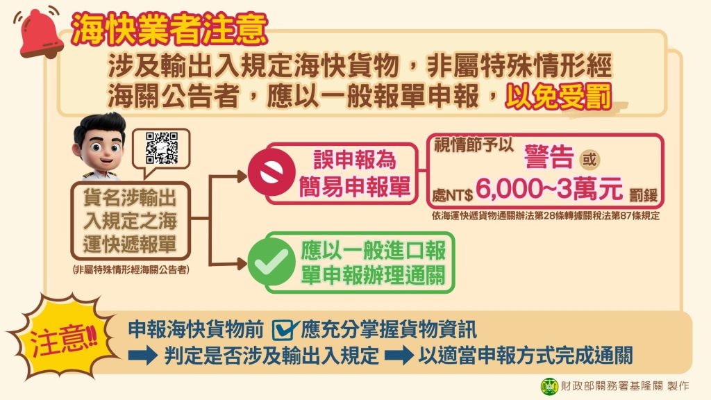 基隆關說明,依據海運快遞貨物通關辦法(下稱海快通關辦法)第12條第1項第2款規定,進出口海運快遞貨物(下稱海快貨物),涉及輸出入規定,非屬特殊情形經海關公告者,應以一般報單申報。違反前開規定以簡易申報單申報者,按海快通關辦法第28條規定,由海關依關稅法第87條規定,予以警告或處新臺幣6,000元以上3萬元以下罰鍰,並得命其限期改正;屆期未改正者,按次處罰;處罰3次仍未完成改正或違規情節重大者,得停止6個月以下海快貨物通關的業務或廢止其登記,業者不可不慎。