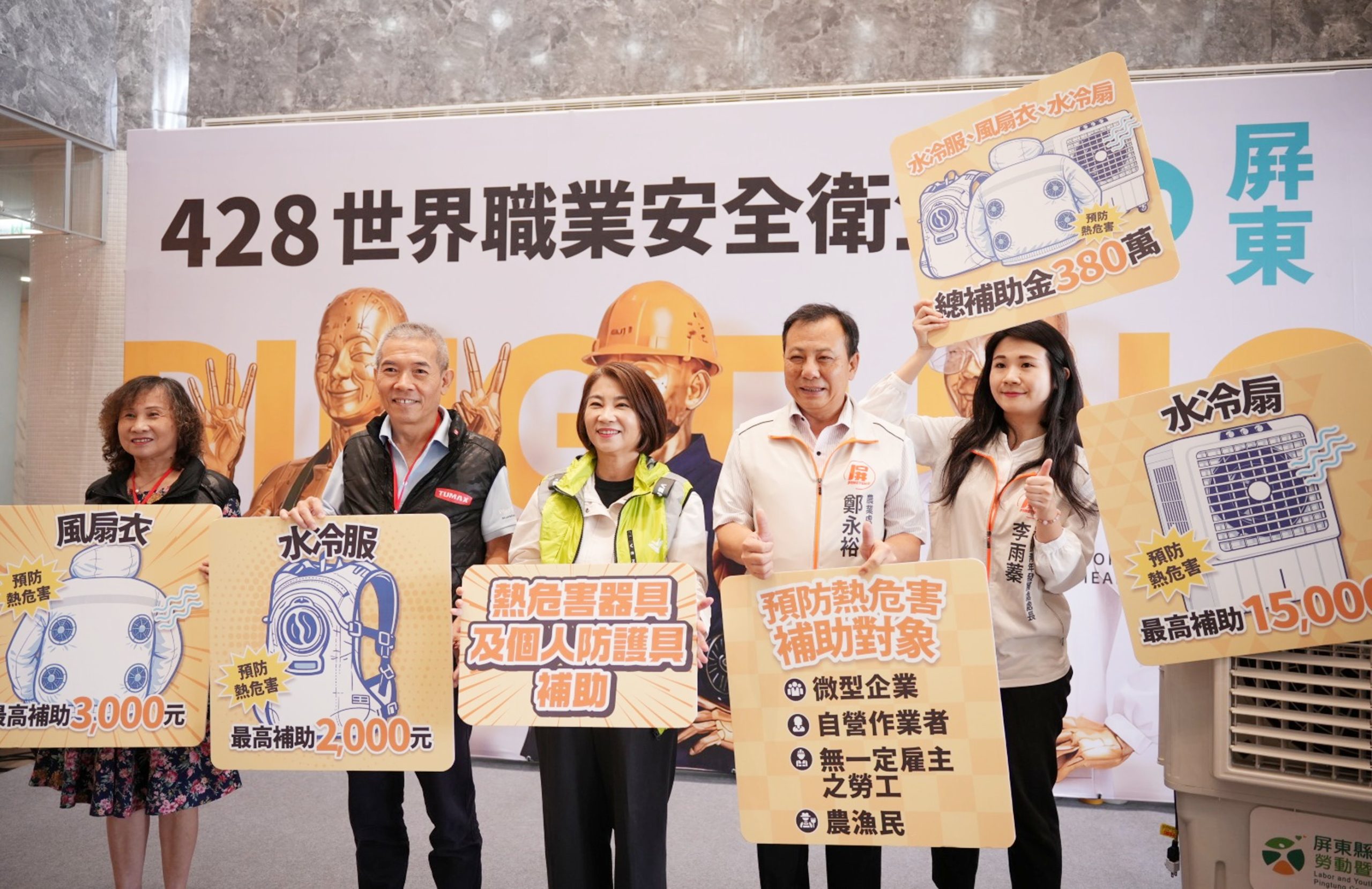 四月二十八日是世界職業安全衛生日,屏東縣長周春米宣布啟動新政「勞工降溫神器」補助,針對一百人以下微型企業、自營作業者、農漁民等身分,提供購買水冷扇、風扇衣及水冷服三大項補助。