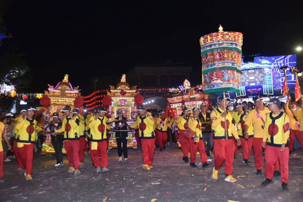 梧棲區大庄浩天宮「大庄媽」百年古香路徒進香,今年首次與「北港媽」攜手回北港朝天宮進香進入雲林,晚間駐駕馬公厝順安宮,現場熱鬧滾滾。(記者陳金龍翻攝)