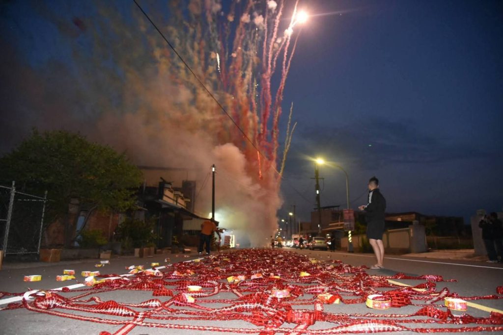 大庄浩天宮「大庄媽」百年古香路徒進香,進香隊伍抵土庫馬光順安宮 煙火齊放迎接 。(記者陳金龍翻攝)