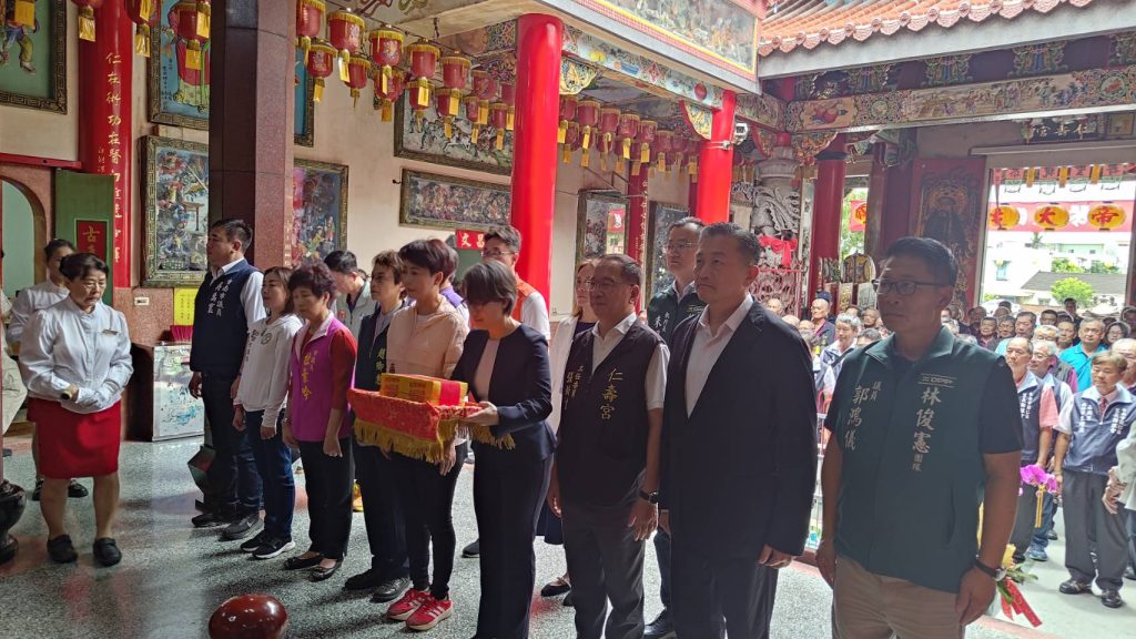 蕭美琴到台南參加「第一屆AI IMPACT智慧城市與大南方成果展示開幕」,結束活動之後,陸續前往歸南北極殿、仁壽宮參拜,受到主委戴榮裕、張鈴宏熱情接待,參拜後並與廟方人員合影留念。副市長趙卿惠、立委陳亭妃、王定宇及多名市議員均到場陪同。