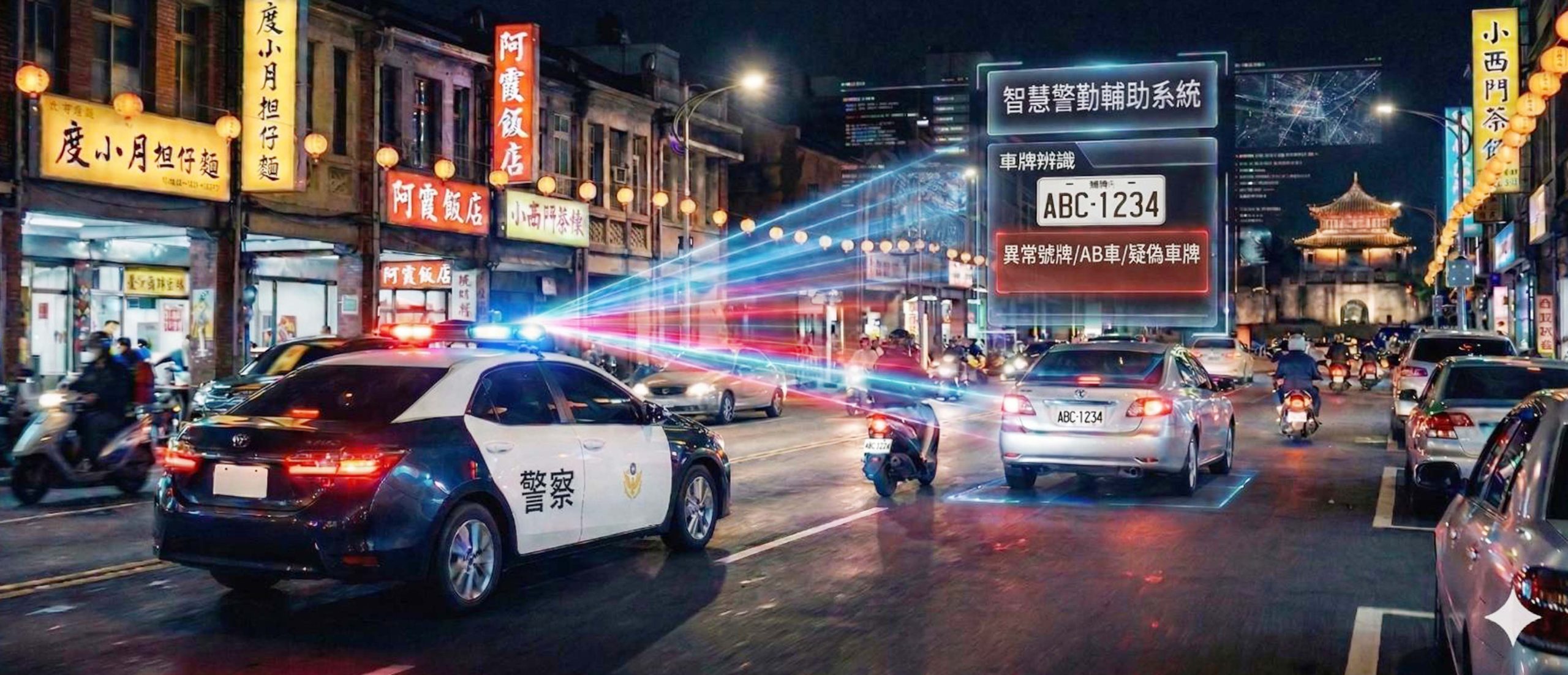 台南市警察局在巡邏車導入智慧警勤輔助系統,連線警政署的資料庫,透過巡邏車動態巡防大街小巷,將發現可疑車輛零時差通報巡邏人員,即時查緝不法,透過智慧科技建構城市安全巡邏網,今年迄今已查獲二百四十五輛涉案車輛、失贓車、AB車、偽(變)造車牌等異常車輛。