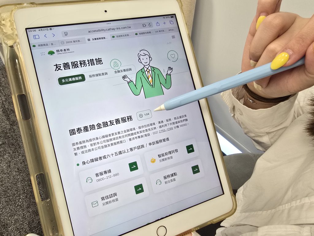 在「資訊可及」面向,國泰產險積極與中華民國無障礙科技發展協會及身心障礙團體交流,並根據回饋持續優化資訊面,包括官網已取得無障礙標章 AAA 認證,介面支援螢幕閱讀器、語音報讀與替代文字,透過響應式網頁設計改善放大不跑版的問題,使視障與高齡族群能順利閱讀內容;為協助不同語言或感官條件的客戶理解保障內容,推出 QR Code 語音導讀與點字版商品介紹,且同時提供英文、越南文、泰文與印尼文等多語系投保與理賠文件,協助新住民以母語理解投保與理賠內容,降低資訊差距。