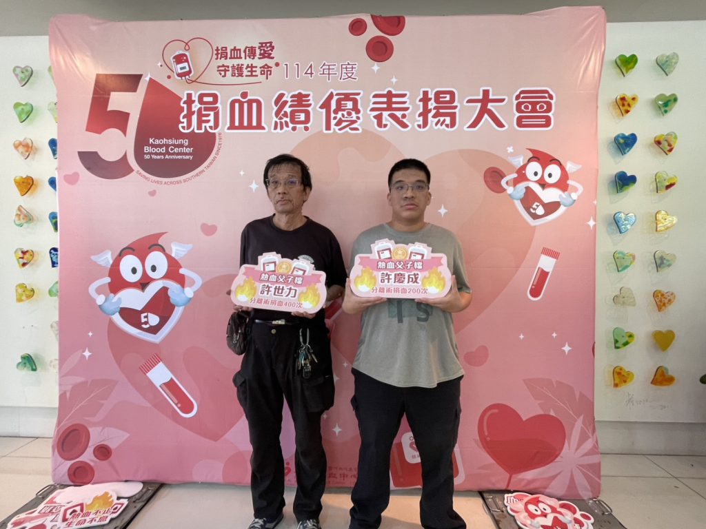 許世力(左)與許慶成(右)父子長期投入捐血行列,分別累計達400次與200次,以行動傳承助人精神,成為捐血典範。(記者林怡孜攝)